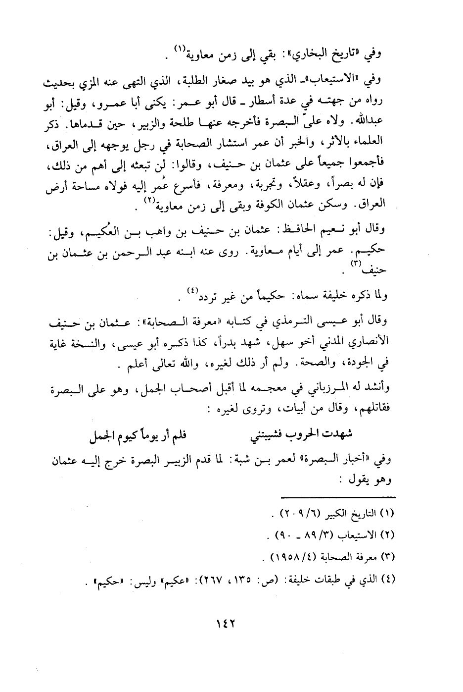 وفي " الاستيعاب " – الذي هو بيد صغار الطلبة، الذي انتهى عنه المزي بحديث رواه من جهته في عدة أسطار – قال أبو عمر: يكنى أبا عمرو، وقيل: أبو عبد الله. ولاه علي البصرة، فأخرجه عنها طلحة والزبير، حين قدماها. ذكر العلماء بالأثر، والخبر أن عمر استشار الصحابة في رجل يوجهه إلى العراق، فأجمعوا جميعا على عثمان بن حنيف، وقالوا: لن تبعثه إلى أهم من ذلك، فإن له بصرا، وعقلا، وتجربة، ومعرفة، فأسرع عمر إليه فولاه مساحة أرض العراق. وسكن عثمان الكوفة وبقي إلى زمن معاوية.