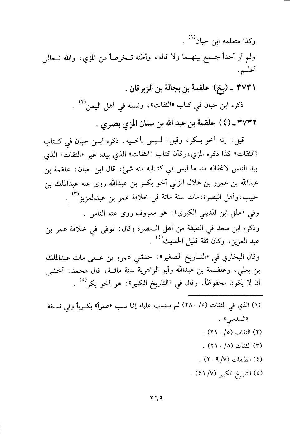 قيل: إنه أخو بكر، وقيل: ليس بأخيه. ذكره ابن حبان في كتاب " الثقات " كذا ذكره المزي، وكأن كتاب " الثقات " الذي بيده غير " الثقات " الذي بيد الناس لإغفاله منه ما ليس في كتابه منه شيء، قال ابن حبان: علقمة بن عبد الله بن عمرو بن هلال المزني أخو بكر بن عبد الله روى عنه عبد الملك بن حبيب، وأهل البصرة، مات سنة مائة في خلافة عمر بن عبد العزيز.