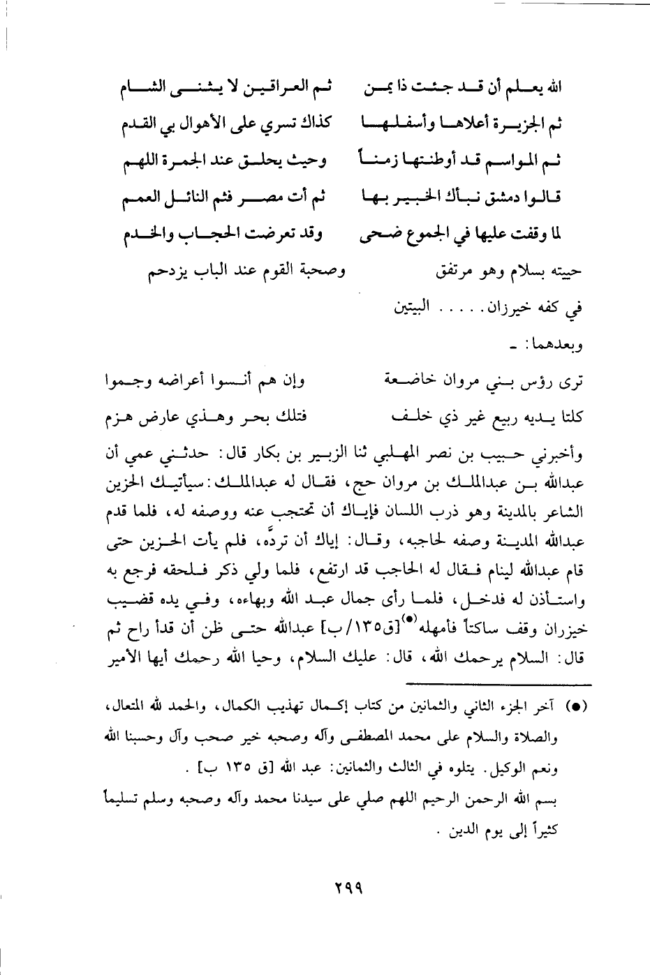 وأخبرني حبيب بن نصر المهلبي، ثنا الزبير بن بكار قال: حدثني عمي أن عبد الله بن عبد الملك بن مروان حج، فقال له عبد الملك: سيأتيك الحزين الشاعر بالمدينة، وهو ذرب اللسان، فإياك أن تحتجب عنه ووصفه له، فلما قدم عبد الله المدينة وصفه لحاجبه، وقال: إياك أن ترده، فلم يأت الحزين حتى قام عبد الله لينام، فقال له الحاجب: قد ارتفع، فلما ولَّى ذُكِرَ فلحقه فرجع به واستأذن له فدخل، فلما رأى جمال عبد الله وبهاءه، وفي يده قضيب خيزران وقف ساكتا فأمهله [ق 135 / ب] عبد الله حتى ظن أن قدأ راح ثم قال: السلام يرحمك الله، قال: عليك السلام، وحيا الله رحمك أيها الأمير