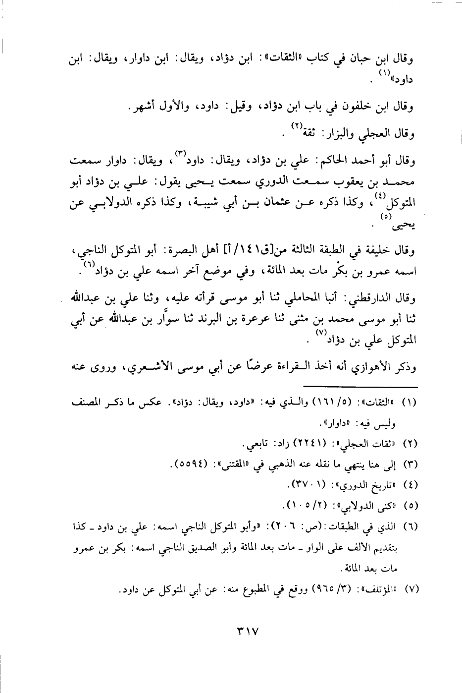 وقال خليفة في الطبقة الثالثة من [ق 141 / أ] أهل البصرة: أبو المتوكل الناجي، اسمه عمرو بن بكر مات بعد المائة، وفي موضع آخر اسمه علي بن دؤاد.