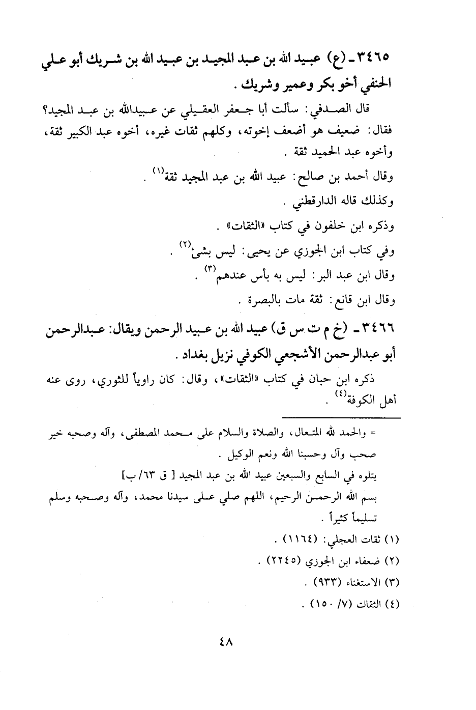3466 - (خ م ت س ق) عبيد الله بن عبيد الرحمن، ويقال: عبد الرحمن أبو عبد الرحمن الأشجعي الكوفي نزيل بغداد.