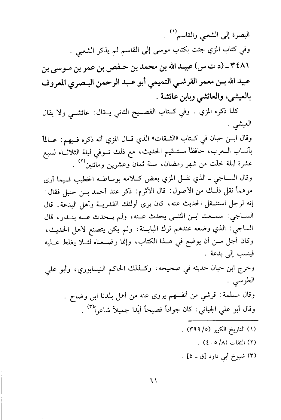 3481 - (د ت س) عبيد الله بن محمد بن حفص بن عمر بن موسى بن عبيد الله بن معمر القرشي التميمي أبو عبد الرحمن البصري المعروف بالعيشي، والعائشي، وبابن عائشة.