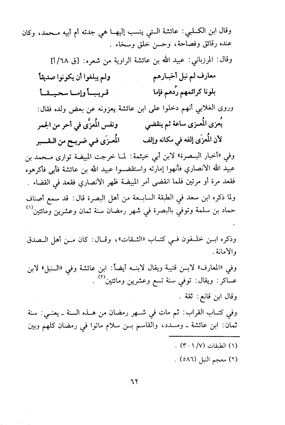 وفي " المعارف " لابن قتيبة، ويقال لابنه أيضا: ابن عائشة وفي " النبل " لابن عساكر: ويقال: توفي سنة تسع وعشرين ومائتين.