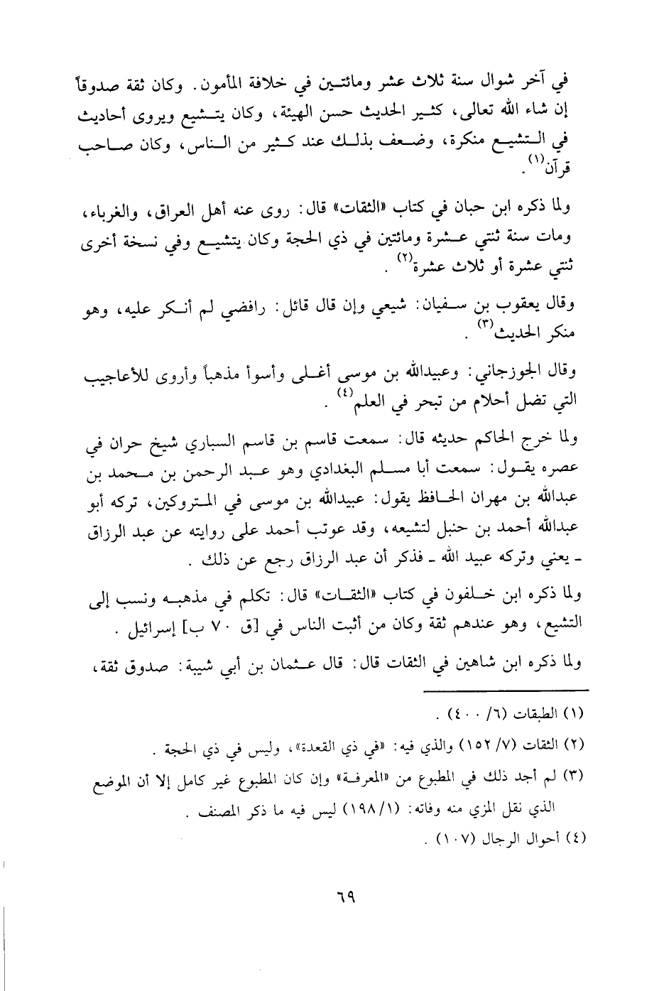 ولما ذكره ابن خلفون في كتاب " الثقات " قال: تكلم في مذهبه ونسب إلى التشيع، وهو عندهم ثقة، وكان من أثبت الناس في [ق 70 ب] إسرائيل.