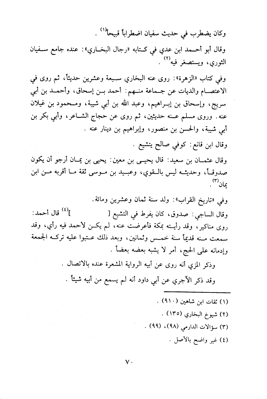 وقال أبو أحمد بن عدي في كتابه " رجال البخاري ": عنده جامع سفيان الثوري، ويستصغر فيه.