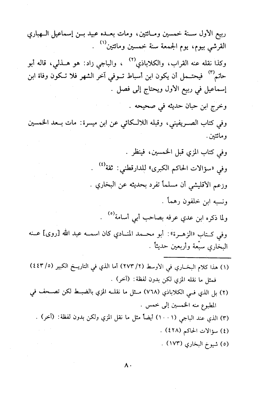 وكذا نقله عنه القراب، والكلاباذي، والباجي زاد: هو هذلي، قاله أبو حاتم، فيحتمل أن يكون ابن أسباط توفي آخر الشهر، فلا تكون وفاة ابن إسماعيل في ربيع الأول ويحتاج إلى فصل.