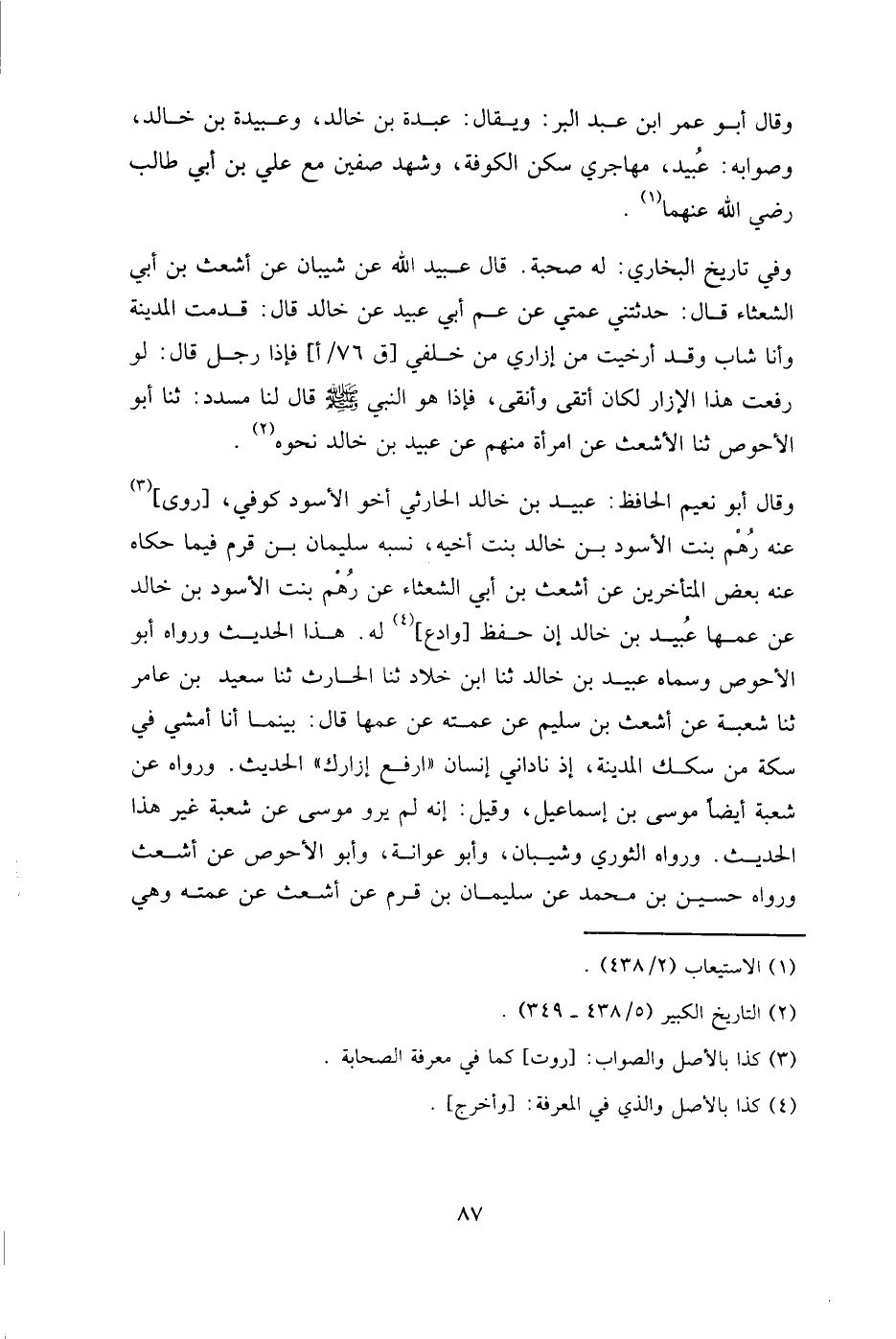 وفي تاريخ البخاري: له صحبة. قال عبيد الله، عن شيبان، عن أشعث بن أبي الشعثاء، قال: حدثتني عمتي، عن عم أبي عبيد، عن خالد قال: قدمت المدينة وأنا شاب وقد أرخيت من إزاري من خلفي [ق 76 / أ] فإذا رجل قال: لو رفعت هذا الإزار لكان أتقى وأنقى، فإذا هو النبي - صلى الله عليه وسلم - قال لنا مسدد: ثنا أبو الأحوص، ثنا الأشعث، عن امرأة منهم، عن عبيد بن خالد، نحوه.