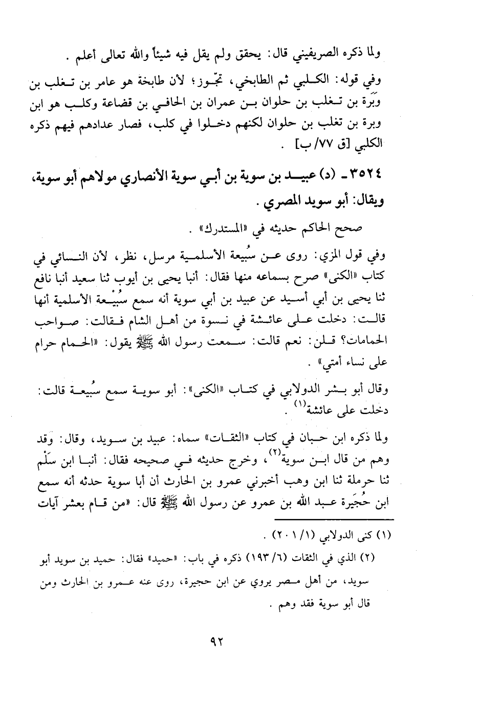 وفي قول المزي: روى عن سبيعة الأسلمية مرسل، نظر؛ لأن النسائي في كتاب " الكنى " صرح بسماعه منها، فقال: أنبا يحيى بن أيوب، ثنا سعيد، أنبا نافع، ثنا يحيى بن أبي أسيد، عن عبيد بن أبي سوية، أنه سمع سبيعة الأسلمية أنها قالت: دخلت على عائشة في نسوة من أهل الشام، فقالت: صواحب الحمامات؟ قلن: نعم. قالت: سمعت رسول الله - صلى الله عليه وسلم - يقول: " الحمام حرام على نساء أمتي ".