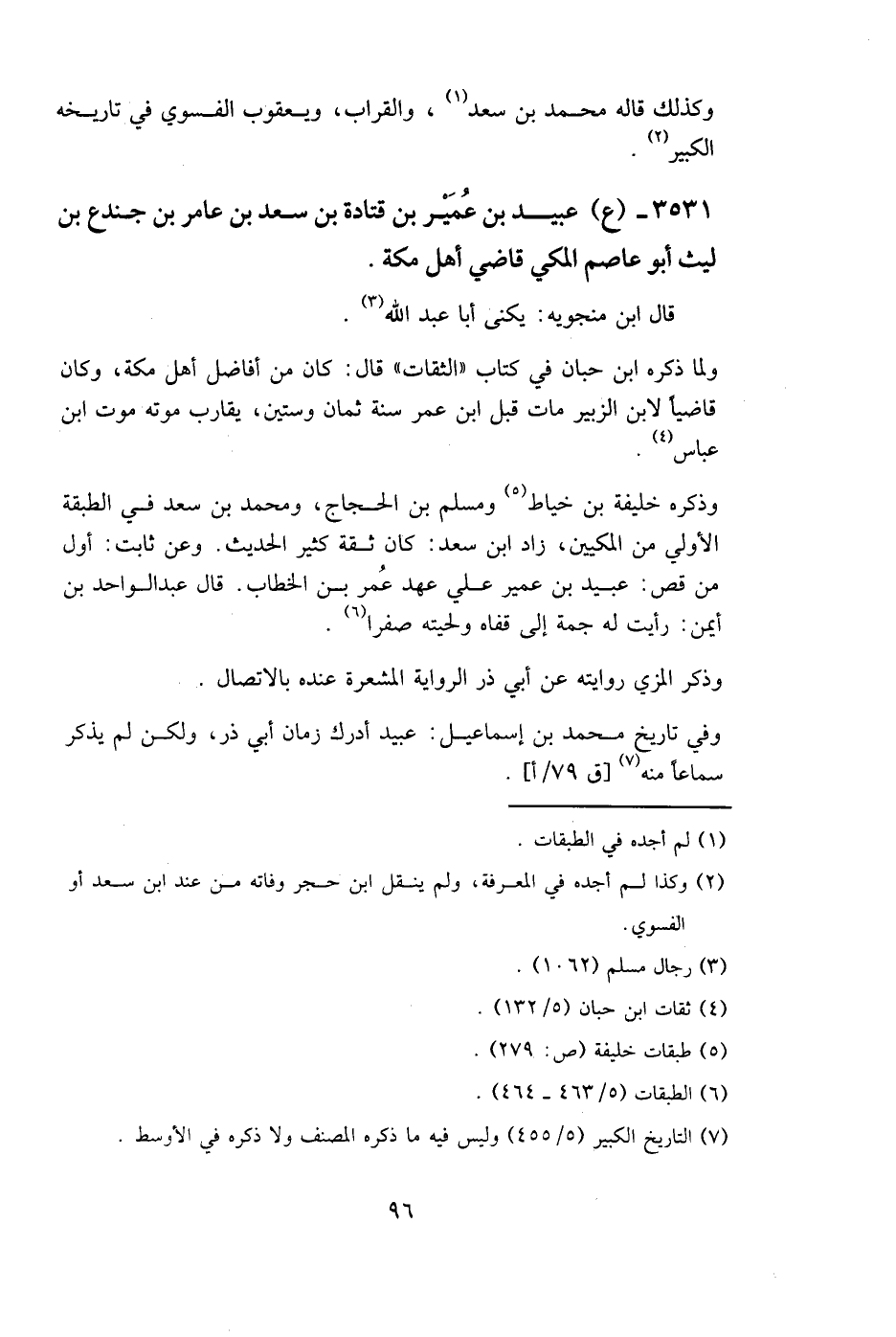 3531 - (ع) عبيد بن عمير بن قتادة بن سعد بن عامر بن جندع بن ليث أبو عاصم المكي قاضي أهل مكة.