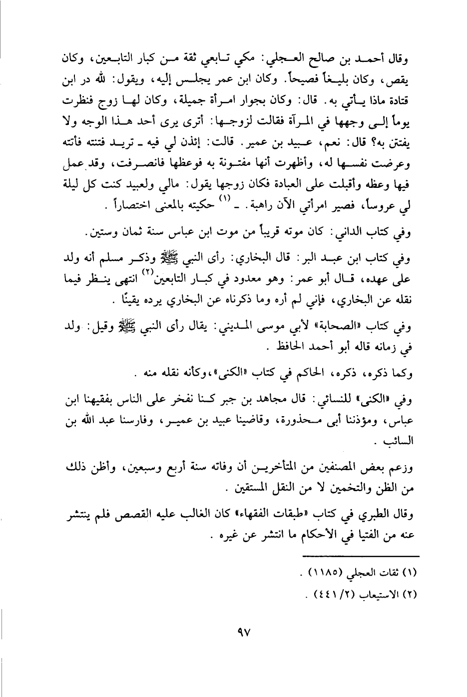 وفي كتاب ابن عبد البر: قال البخاري: رأى النبي - صلى الله عليه وسلم - وذكر مسلم أنه ولد على عهده، قال أبو عمر: وهو معدود في كبار التابعين انتهى، ينظر فيما نقله عن البخاري، فإني لم أره وما ذكرناه عن البخاري يرده يقينا.