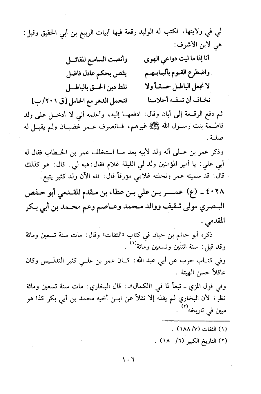 4028 - (ع) عمر بن علي بن عطاء بن مقدم المقدمي أبو حفص البصري مولى ثقيف ووالد محمد وعاصم وعم محمد بن أبي بكر المقدمي.