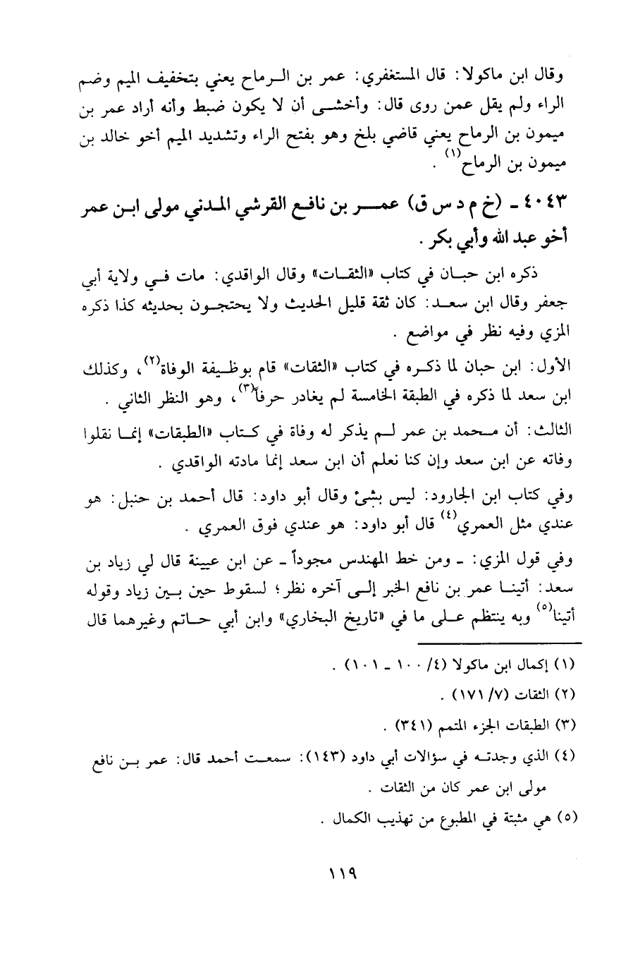 الأول: ابن حبان لما ذكره في كتاب " الثقات " قام بوظيفة الوفاة، وكذلك ابن سعد لما ذكره في الطبقة الخامسة لم يغادر حرفًا، وهو النظر الثاني.