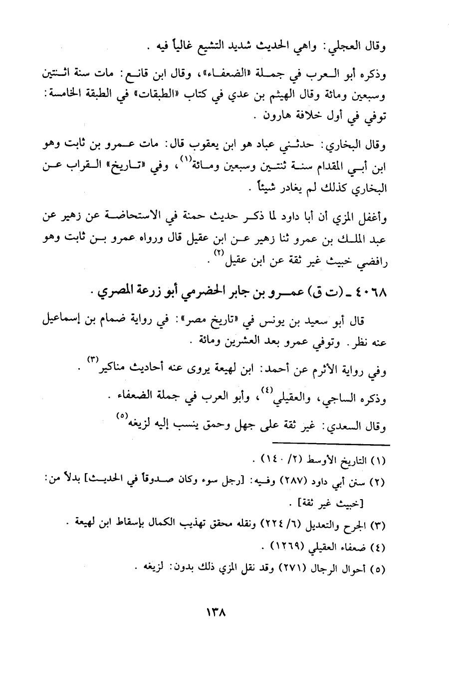 وأغفل المزي أن أبا داود لما ذكر حديث حمنة في الاستحاضة عن زهير عن عبد الملك بن عمرو، ثنا زهير عن ابن عقيل قال ورواه عمرو بن ثابت وهو رافضي خبيث غير ثقة عن ابن عقيل.