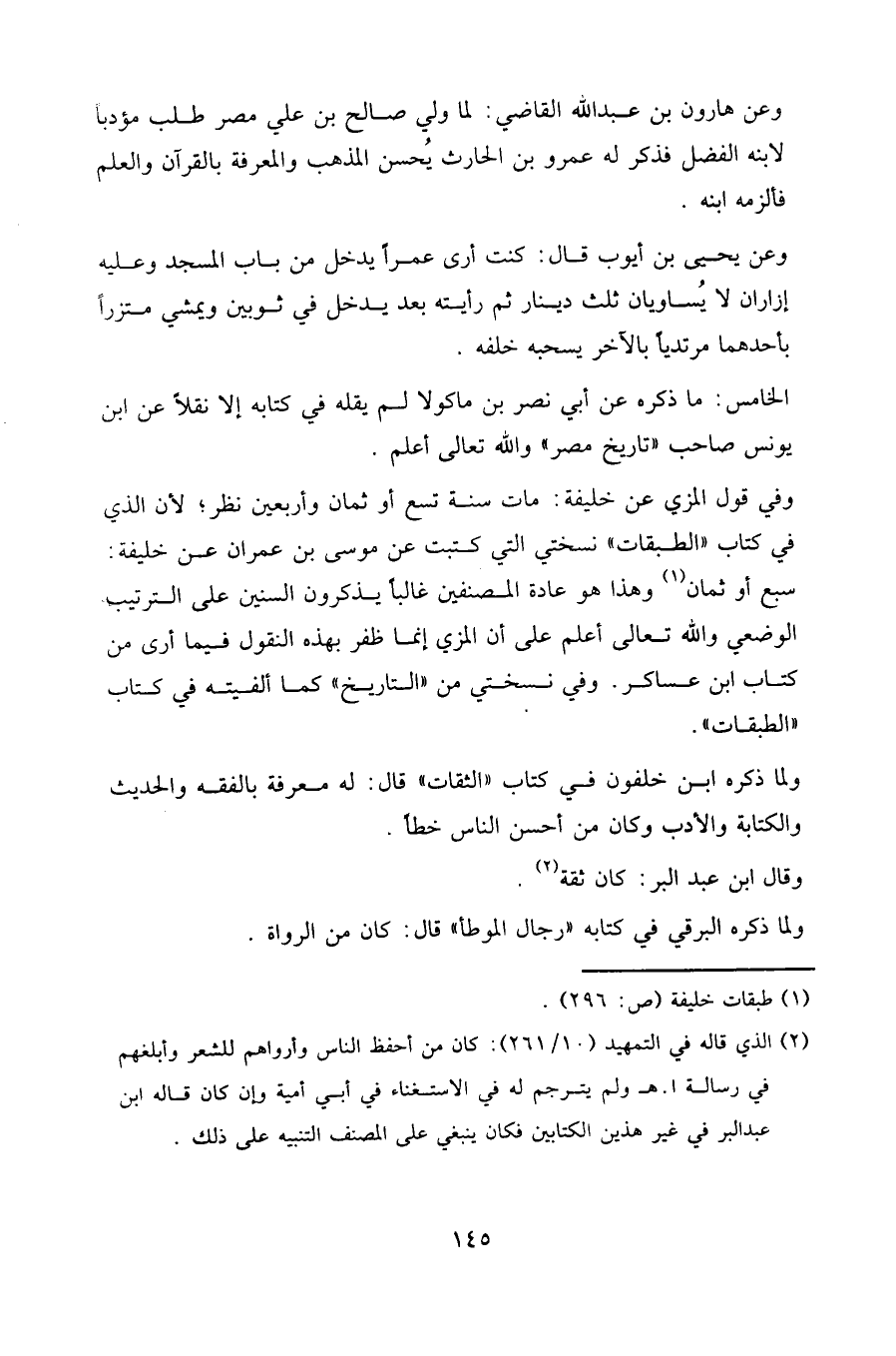 وفي قول المزي عن خليفة: مات سنة تسع أو ثمان وأربعين نظر؛ لأن الذي في كتاب " الطبقات " نسختي التي كتبت عن موسى بن عمران عن خليفة: سبع أو ثمان وهذا هو عادة المصنفين غالبًا يذكرون السنين على الترتيب الوضعي والله تعالى أعلم على أن المزي إنما ظفر بهذه النقول فيما أرى من كتاب ابن عساكر.