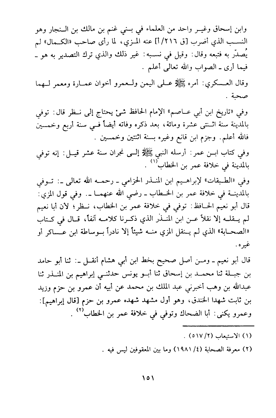 وفي قول المزي: قال أبو نعيم الحافظ: توفي في خلافة عمر بن الخطاب، نظر؛ لأن أبا نعيم لم يقله إلا نقلًا عن ابن المنذر الذي ذكرنا كلامه آنفًا، قال في كتاب " الصحابة " الذي لم ينقل المزي منه شيئًا إلا نادرًا بوساطة ابن عساكر أو غيره.