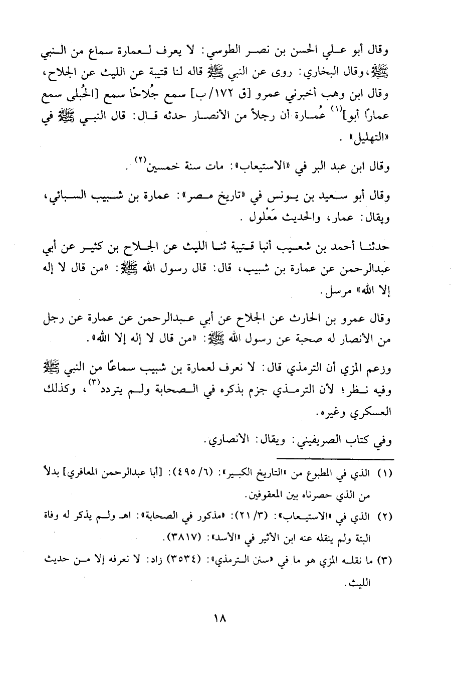 وقال أبو علي الحسن بن نصر الطوسي: لا يعرف لعمارة سماع من النبي صلى الله عليه وسلم، وقال البخاري: روى عن النبي صلى الله عليه وسلم. قاله لنا قتيبة، عن الليث، عن الجلاح، وقال ابن وهب: أخبرني عمرو [ق 172/ب] سمع جلاحًا، سمع [الحلبي سمع عمارًا أبو] عمارة أن رجلًا من الأنصار حدثه، قال: قال النبي صلى الله عليه وسلم في " التهليل ".