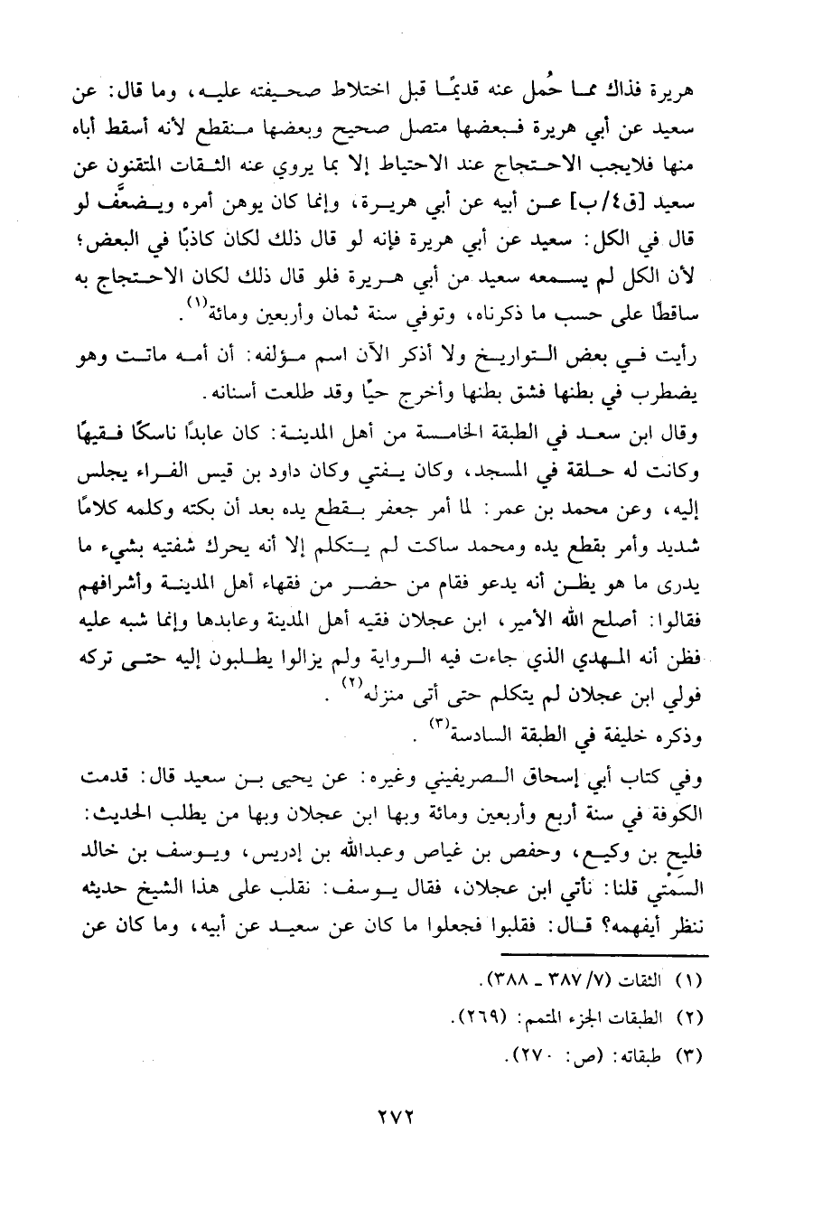 هريرة فذاك مما حمل عنه قديمًا قبل اختلاط صحيفته عليه، وما قال: عن سعيد عن أبي هريرة؛ فبعضها متصل صحيح وبعضها منقطع لأنه أسقط أباه منها فلا يجب الاحتجاج عند الاحتياط إلا بما يروي عنه الثقات المتقنون عن سعيد [ق 4/ب] عن أبيه عن أبي هريرة، وإنما كان يوهن أمره ويضعف لو قال في الكل: سعيد عن أبي هريرة فإنه لو قال ذلك لكان كاذبًا في البعض؛ لأن الكل لم يسمعه سعيد من أبي هريرة فلو قال ذلك لكان الاحتجاج به ساقطًا على حسب ما ذكرناه، وتوفي سنة ثمان وأربعين ومائة.