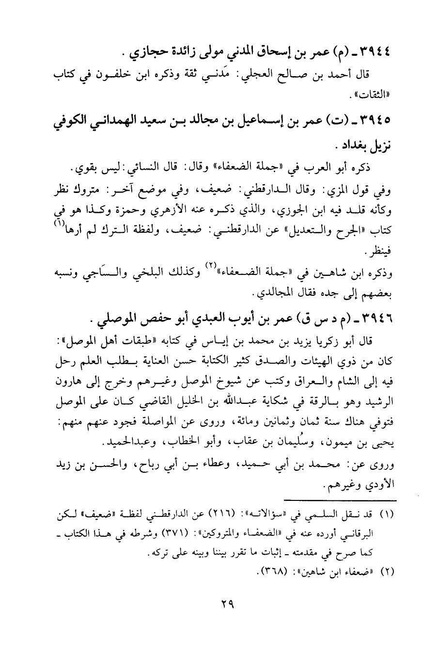 3945 - (ت) عمر بن إسماعيل بن مجالد بن سعيد الهمداني الكوفي نزيل بغداد.