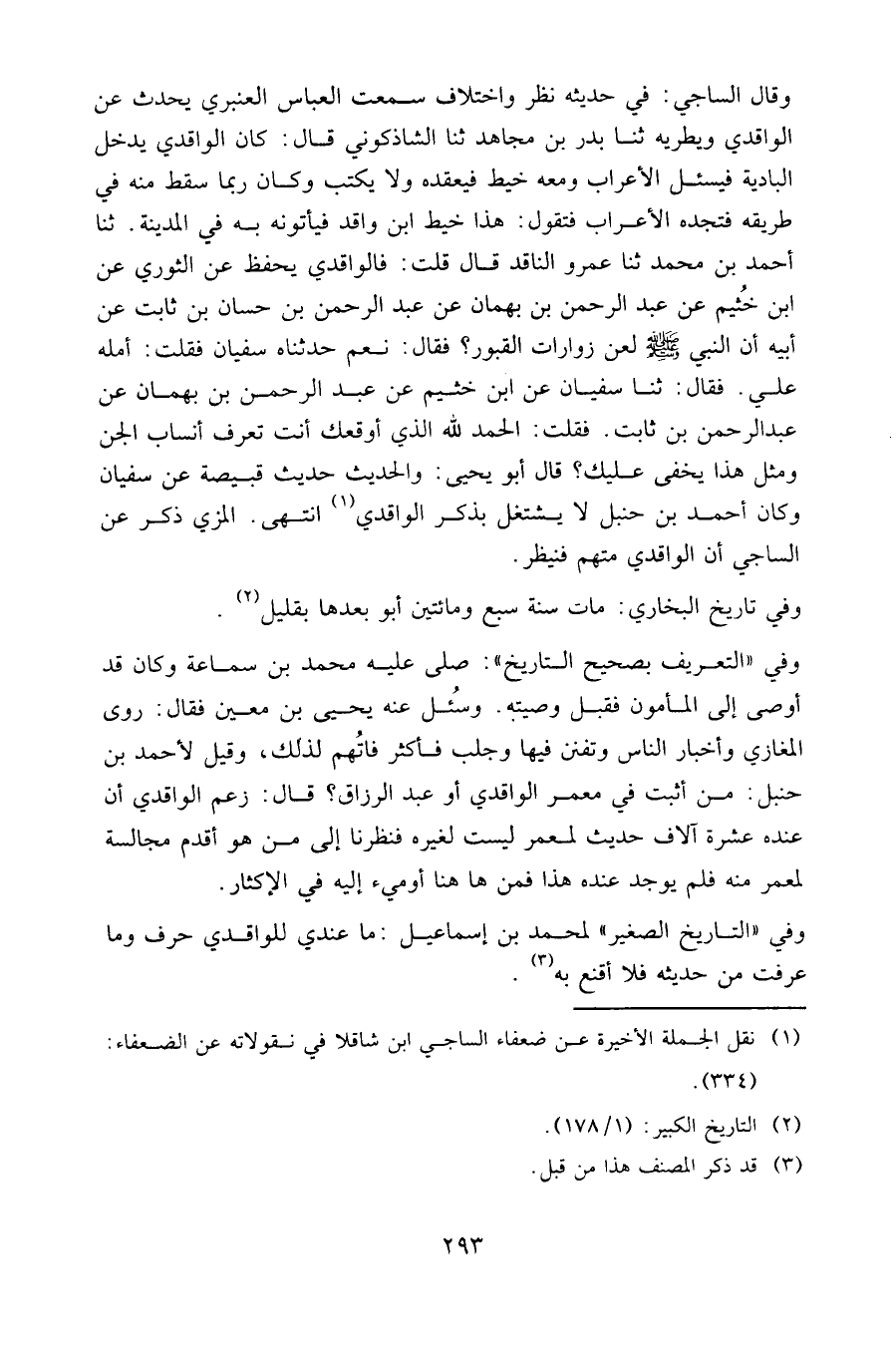 وقال الساجي: في حديثه نظر واختلاف سمعت العباس العنبري يحدث عن الواقدي ويطريه، ثنا بدر بن مجاهد، ثنا الشاذكوني قال: كان الواقدي يدخل البادية فيسأل الأعراب ومعه خيط فيعقده ولا يكتب، وكان ربما سقط منه في طريقه فتجده الأعراب فتقول: هذا خيط ابن واقد فيأتونه به في المدينة.