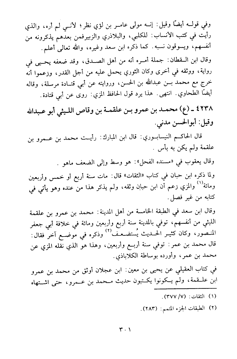 4238 - (ع) محمد بن عمرو بن علقمة بن وقاص الليثي أبو عبد اللّه وقيل: أبو الحسن مدني.