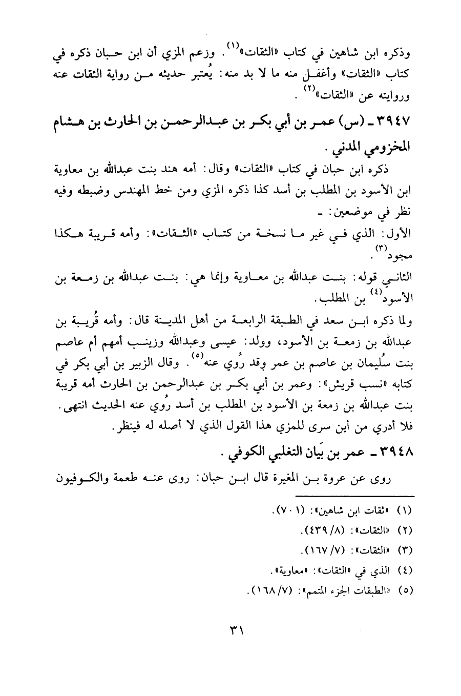وزعم المزي أن ابن حبان ذكره في كتاب " الثقات " وأغفل منه ما لا بد منه: يعتبر حديثه من رواية الثقات عنه وروايته عن " الثقات ".