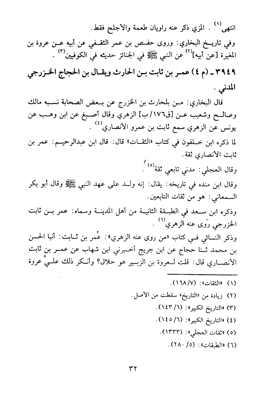 3949 - (م4) عمر بن ثابت بن الحارث، ويقال: ابن الحجاج الخزرجي المدني.