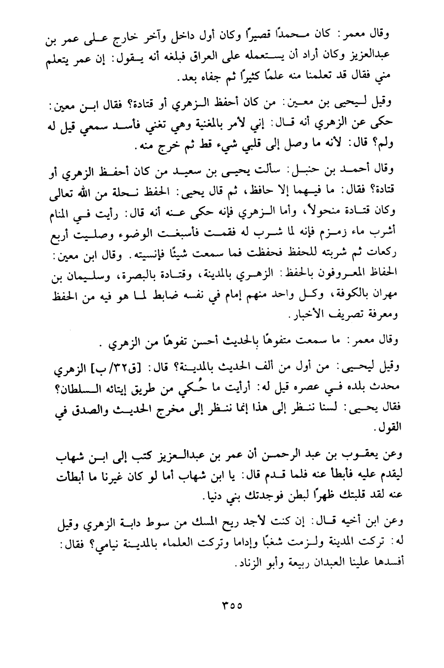وعن يعقوب بن عبد الرحمن أن عمر بن عبد العزيز كتب إلى ابن شهاب ليقدم عليه فأبطأ عنه؛ فلما قدم قال: يا ابن شهاب أما لو كان غيرنا ما أبطأت عنه لقد قلبتك ظهرًا لبطن فوجدتك بني دنيا.