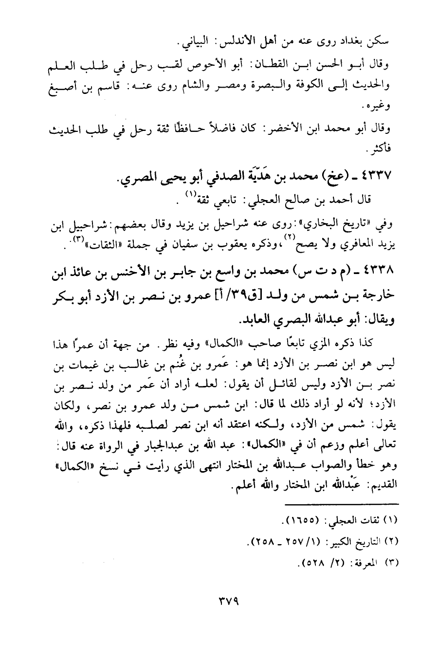 من جهة أن عمرًا هذا ليس هو ابن نصر بن الأزد إنما هو: عمرو بن غنم بن غالب بن غيمات بن نصر بن الأزد، وليس لقائل أن يقول: لعله أراد أن عمر من ولد نصر بن الأزد؛ لأنه لو أراد ذلك لما قال: ابن شمس من ولد عمرو بن نصر، ولكان يقول: شمس من الأزد، ولكنه اعتقد أنه ابن نصر لصلبه فلهذا ذكره، والله تعالى أعلم وزعم أن في " الكمال ": عبد الله بن عبد الجبار في الرواة عنه قال: وهو خطأ والصواب عبد الله بن المختار انتهى الذي رأيت في نسخ " الكمال " القديم: عبد الله ابن المختار والله أعلم.