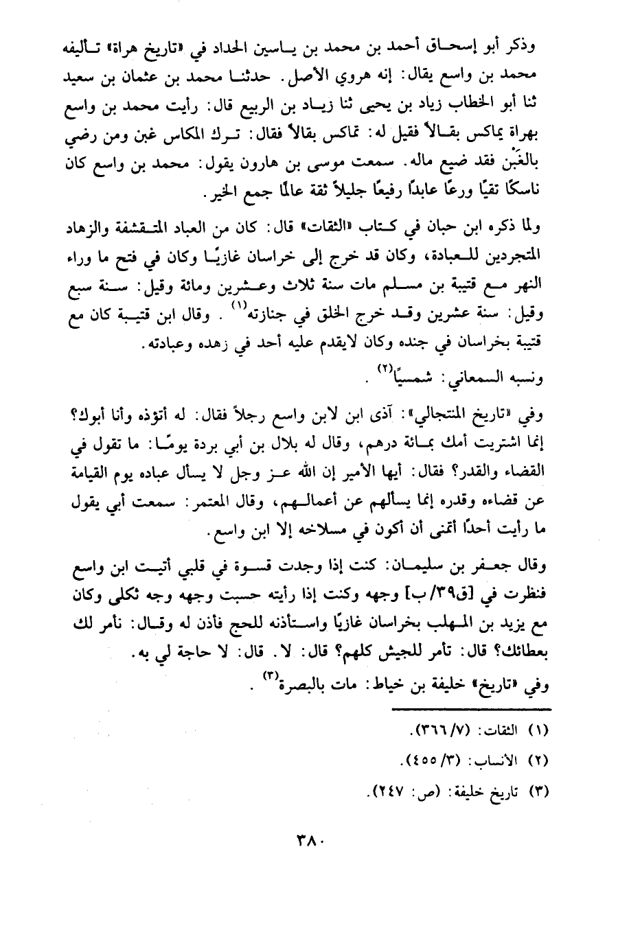 وذكر أبو إسحاق أحمد بن محمد بن ياسين الحداد في " تاريخ هراة " تأليفه محمد بن واسع يقال: إنه هروي الأصل.