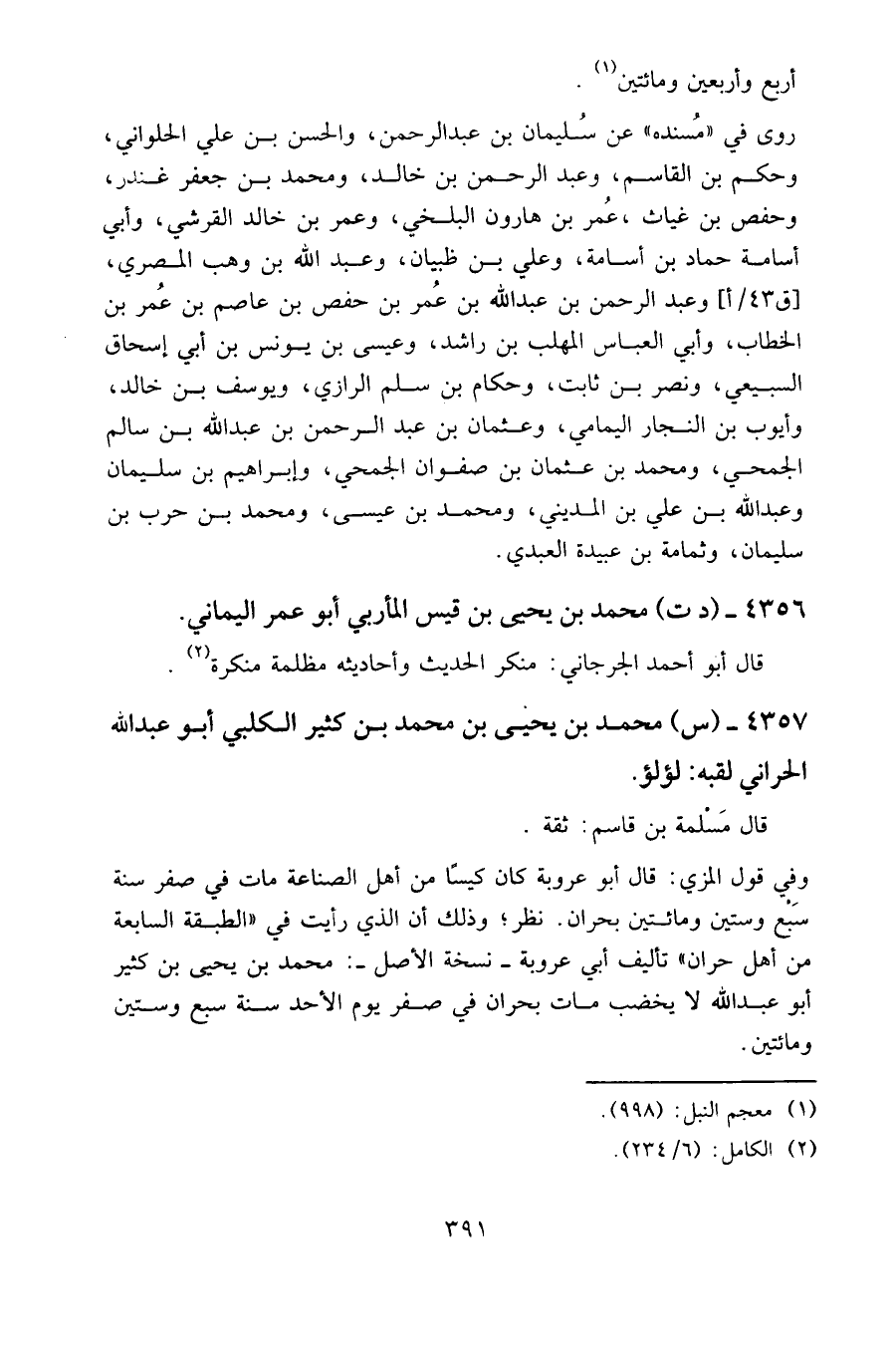 وفي قول المزي: قال أبو عروبة كان كيسا من أهل الصناعة، مات في صفر سنة سبع وستين ومائتين بحران. نظر؛ وذلك أن الذي رأيت في " الطبقة السابعة من أهل حران " تأليف أبي عروبة – نسخة الأصل -: محمد بن يحيى بن كثير أبو عبد الله لا يخضب، مات بحران في صفر يوم الأحد سنة سبع وستين ومائتين.