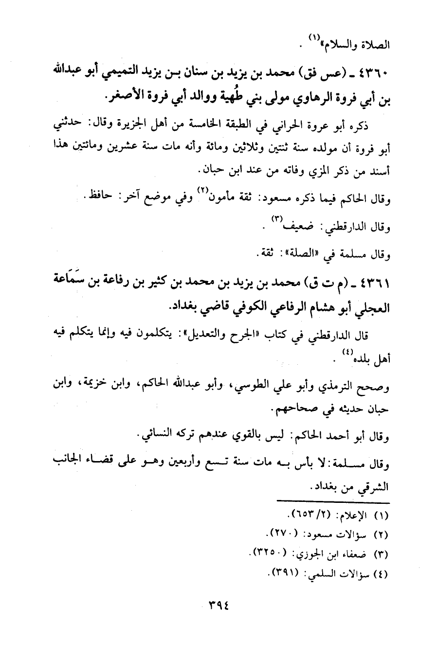 4360 - " عس فق " محمد بن يزيد بن سنان بن يزيد التميمي أبو عبد الله بن أبي فروة الرهاوي مولى بني طهية ووالد أبي فروة الأصغر.