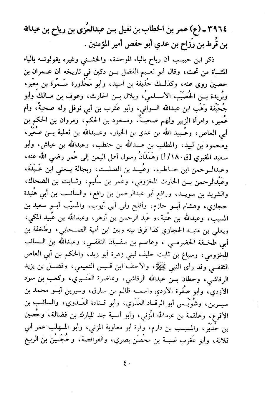 3964 - (ع) عمر بن الخطاب بن نفيل بن عبد العزى بن رباح بن عبد الله بن قرط بن رزاح بن عدي أبو حفص أمير المؤمنين.