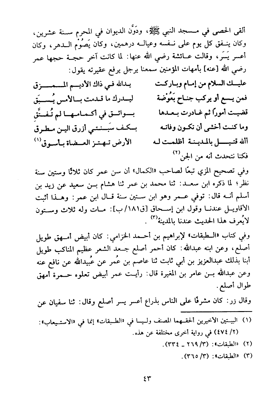وفي تصحيح المزي تبعًا لصاحب " الكمال " أن سن عمر كان ثلاثًا وستين سنة نظر؛ لما ذكره ابن سعد: ثنا محمد بن عمر، ثنا هشام بن سعيد، عن زيد بن أسلم أنه قال: توفي عمر وهو ابن ستين سنة. قال ابن عمر: وهذا أثبت الأقاويل عندنا. وقول ابن إسحاق [ق 181/ب]: مات وله ثلاث وستون، لا يعرف هذا الحديث عندنا بالمدينة.