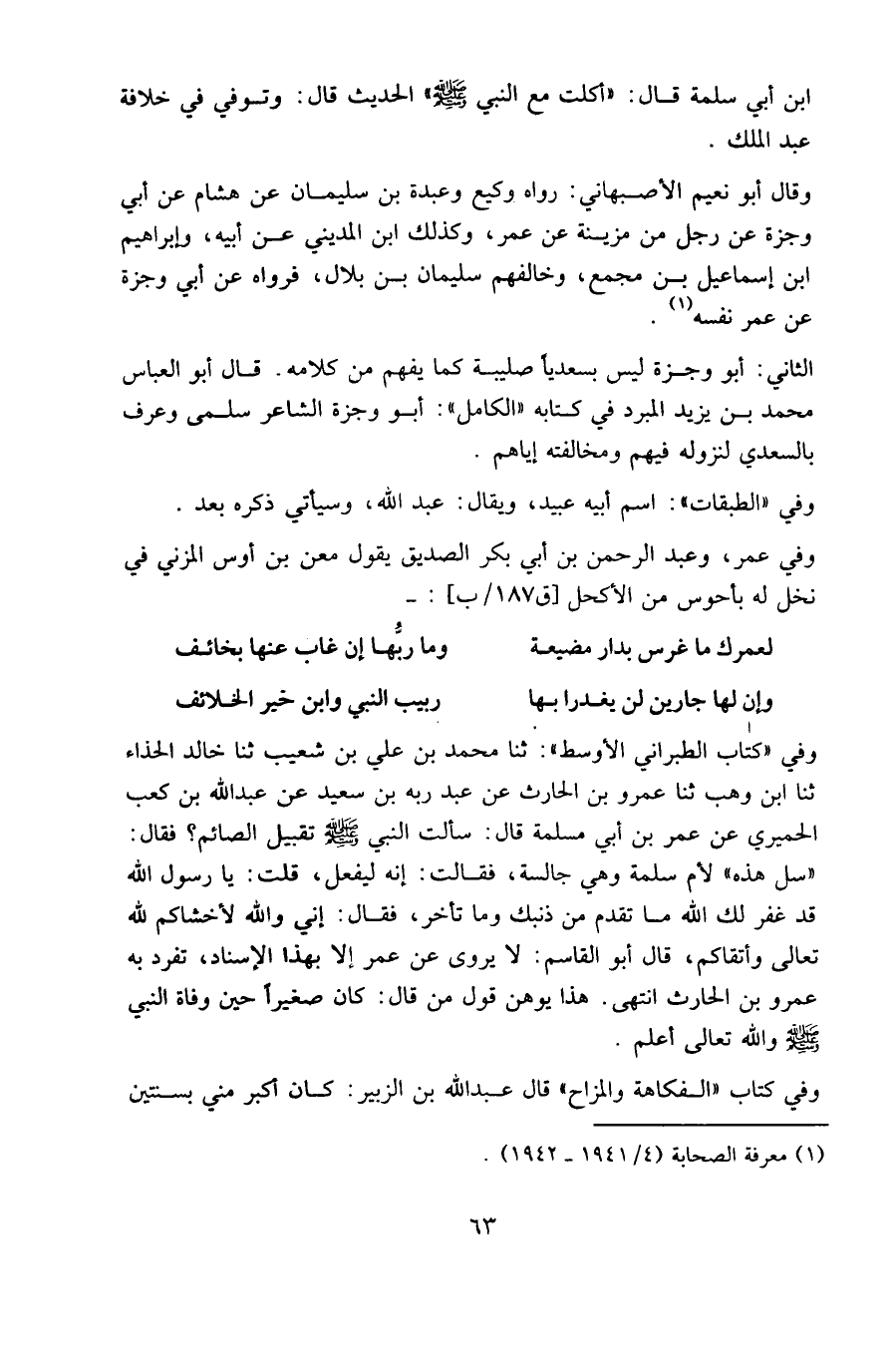 ابن أبي سلمة قال: " أكلت مع النبي صلى الله عليه وسلم " الحديث قال: وتوفي في خلافة عبد الملك.