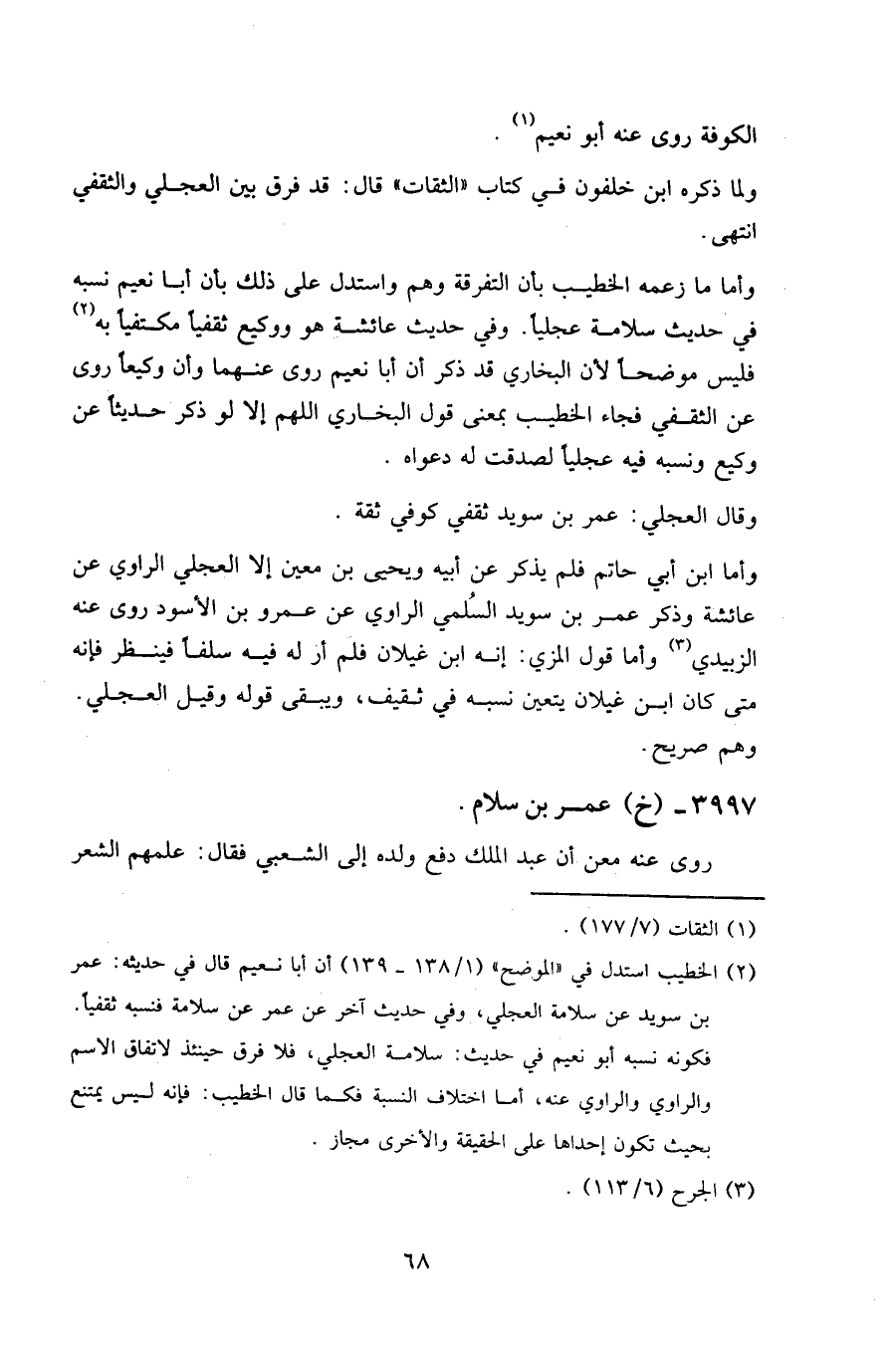 وأما ابن أبي حاتم فلم يذكر عن أبيه ويحيى بن معين إلا العجلي الراوي عن عائشة، وذكر عمر بن سويد السلمي الراوي عن عمرو بن الأسود روى عنه الزبيدي، وأما قول المزي: إنه ابن غيلان فلم أر له فيه سلفًا فينظر؛ فإنه متى كان ابن غيلان يتعين نسبه في ثقيف، ويبقى قوله وقيل العجلي.