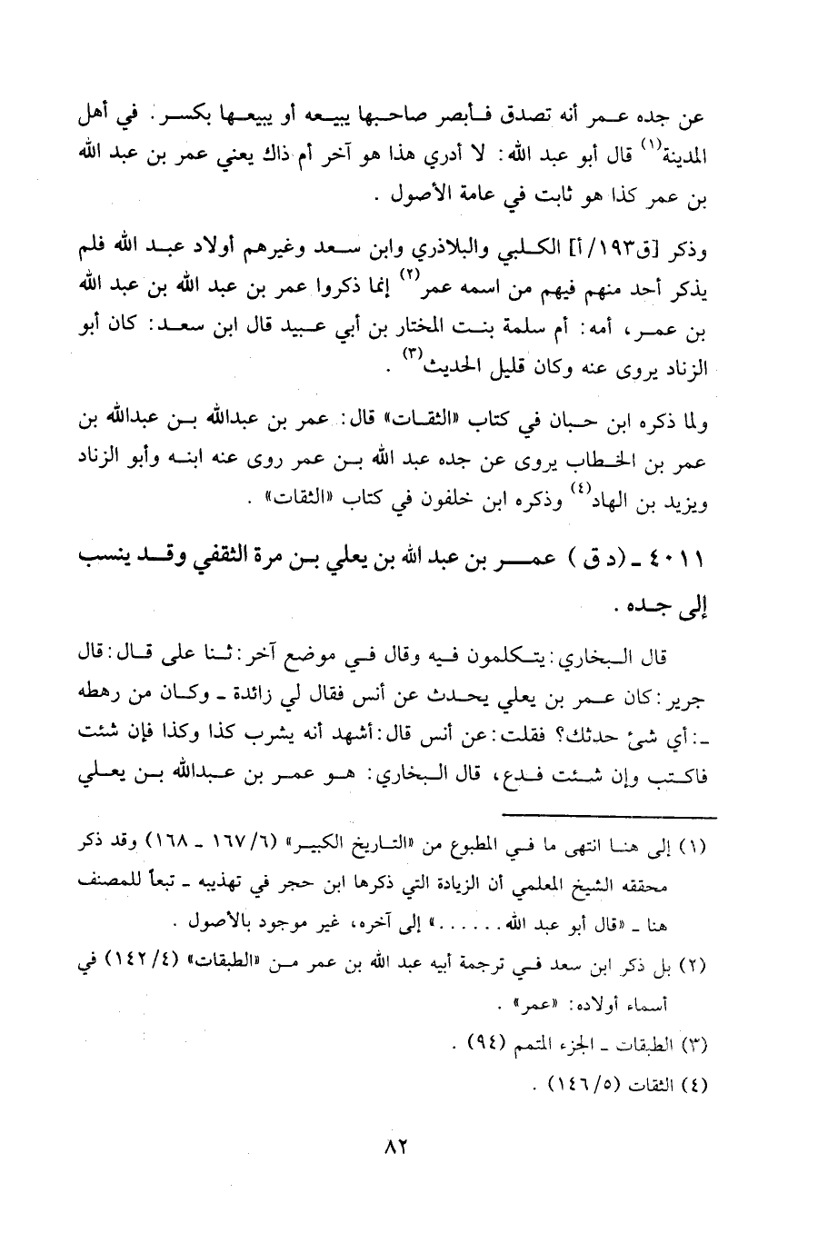 ولما ذكره ابن حبان في كتاب " الثقات " قال: عمر بن عبد الله بن عبد الله بن عمر بن الخطاب يروي عن جده عبد الله بن عمر، روى عنه ابنه وأبو الزناد ويزيد بن الهاد وذكره ابن خلفون في كتاب " الثقات ".