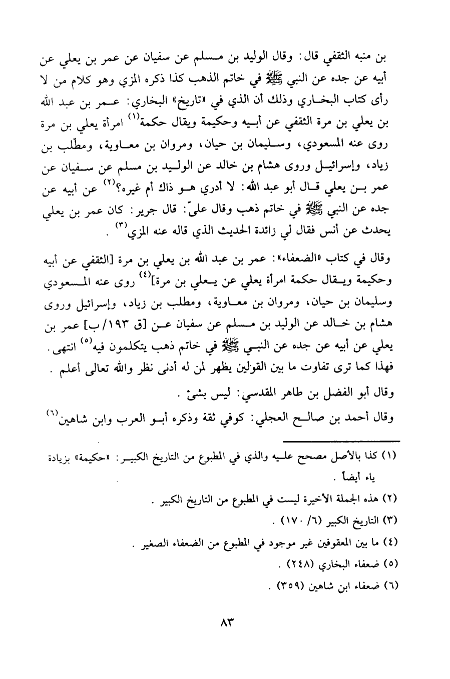 ابن منبه الثقفي قال: وقال الوليد بن مسلم عن سفيان عن عمر بن يعلى عن أبيه عن جده عن النبي صلى الله عليه وسلم في خاتم الذهب كذا ذكره المزي وهو كلام من لا رأى كتاب البخاري وذلك أن الذي في " تاريخ " البخاري: عمر بن عبد الله بن يعلى بن مرة الثقفي عن أبيه وحكيمة ويقال حكمة امرأة يعلى بن مرة روى عنه المسعودي، وسليمان بن حيان، ومروان بن معاوية، ومطلب بن زياد، وإسرائيل وروى هشام بن خالد عن الوليد بن مسلم عن سفيان عن عمر بن يعلى قال أبو عبد الله: لا أدري هو ذاك أم غيره؟ عن أبيه عن جده عن النبي صلى الله عليه وسلم في خاتم ذهب وقال علي: قال جرير: كان عمر بن يعلى يحدث عن أنس فقال لي زائدة الحديث الذي قاله عنه المزي.