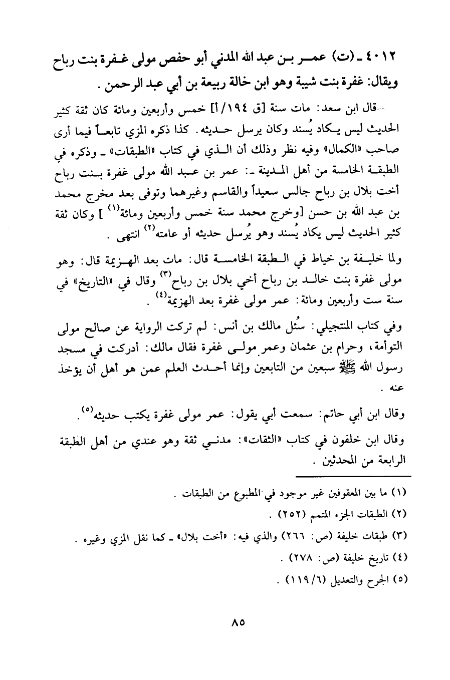 ولما خليفة بن خياط في الطبقة الخامسة قال: مات بعد الهزيمة قال: وهو مولى غفرة بنت خالد بن رباح أخي بلال بن رباح وقال في " التاريخ " في سنة ست وأربعين ومائة: عمر مولى غفرة بعد الهزيمة.