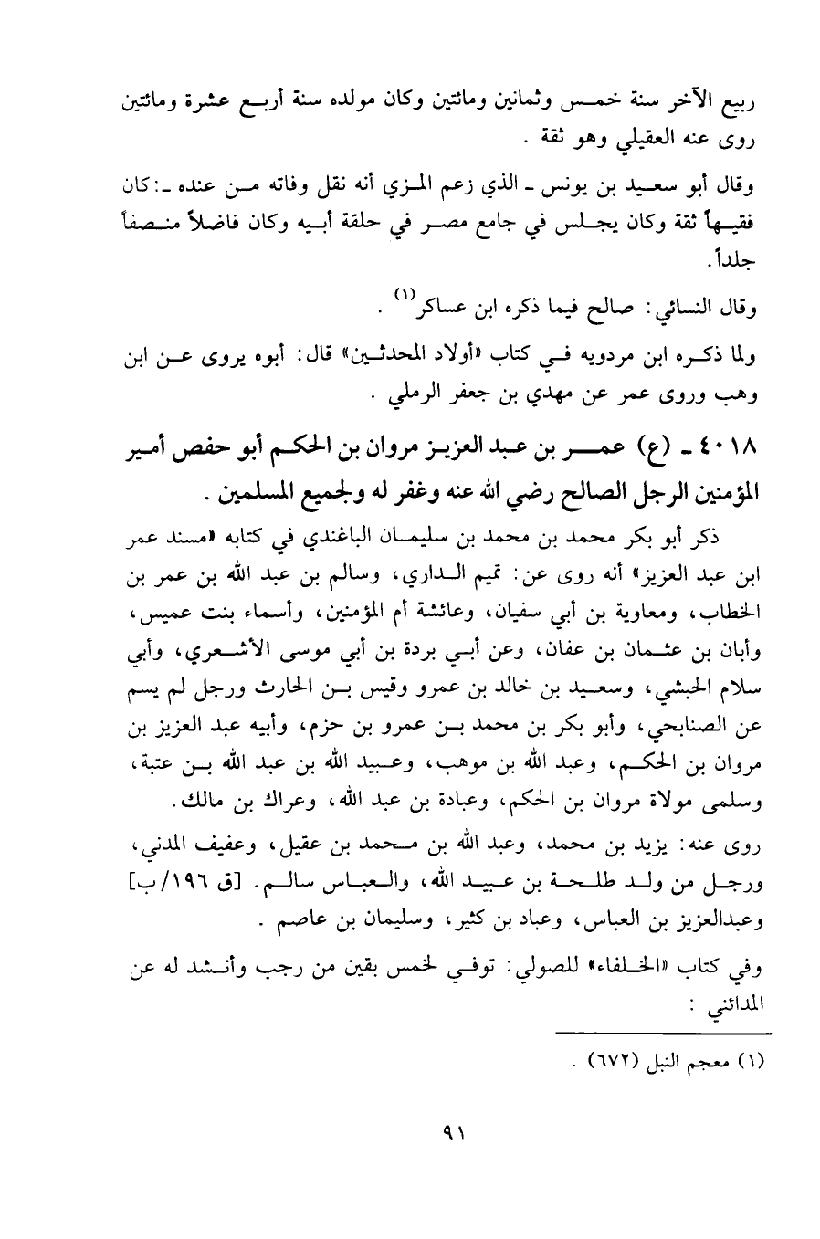 4018 - (ع) عمر بن عبد العزيز مروان بن الحكم أبو حفص أمير المؤمنين الرجل الصالح رضي الله عنه وغفر له ولجميع المسلمين.