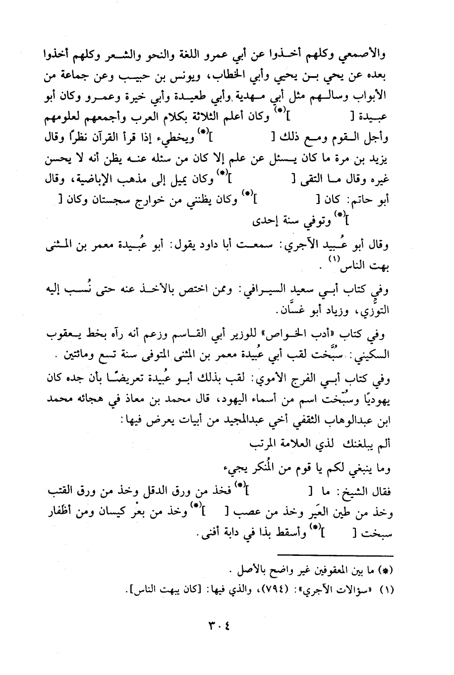 والأصمعي، وكلهم أخذوا عن أبي عمرو اللغة والنحو والشعر، وكلهم أخذوا بعده عن يحيى بن يحيى وأبي الخطاب ويونس بن حبيب، وعن جماعة من الأبواب، وسالهم مثل أبي مهدية وأبي طعيدة وأبي خيرة وعمرو، وكان أبو عبيدة []، وكان أعلم الثلاثة بكلام العرب وأجمعهم لعلومهم وأجل القوم، ومع ذلك [] ويخطئ إذا قرأ القرآن نظرا، وقال يزيد بن مرة: ما كان يسئل عن علم إلا كان من سأله عنه يظن أنه لا يحسن غيره، وقال: ما التقى []، وكان يميل إلى مذهب الإباضية، وقال أبو حاتم: كان []، وكان يظنني من خوارج سجستان، وكان []، وتوفي سنة إحدى.