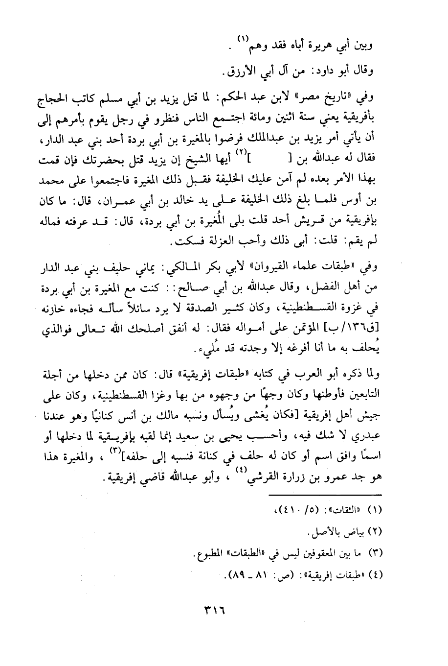 ولما ذكره أبو العرب في كتابه «طبقات إفريقية» قال: كان ممن دخلها من أجلة التابعين فأوطنها، وكان وجها من وجوه من بها، وغزا القسطنطينية، وكان على جيش أهل إفريقية، فكان يغشى ويسأل، ونسبه مالك بن أنس كنانيا، وهو عندنا عبدري، لا شك فيه، وأحسب يحيى بن سعيد إنما لقيه بإفريقية لما دخلها، أو اسما وافق اسم، أو كان له حلف في كنانة فنسبه إلى حلفه، والمغيرة هذا هو جد عمرو بن زرارة القرشي، وأبو عبد الله قاضي إفريقية.