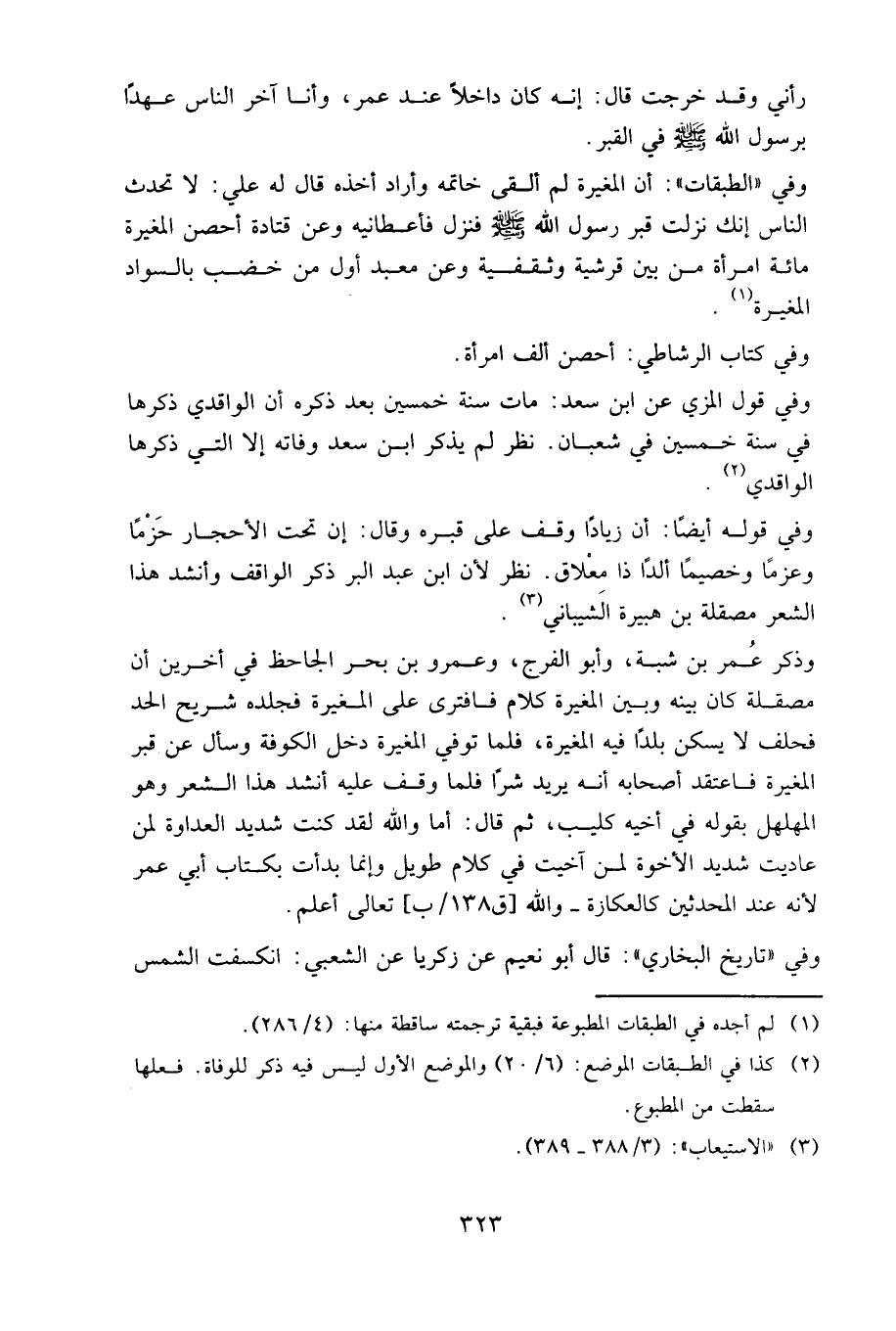 وفي «الطبقات» أن المغيرة لما ألقى خاتمه وأراد أخذه قال له علي: لا تحدث الناس أنك نزلت قبر رسول الله صلى الله عليه وسلم، فنزل فأعطانيه. وعن قتادة: أحصن المغيرة مائة امرأة من بين قرشية وثقفية. وعن معبد: أول من خضب بالسواد المغيرة.
