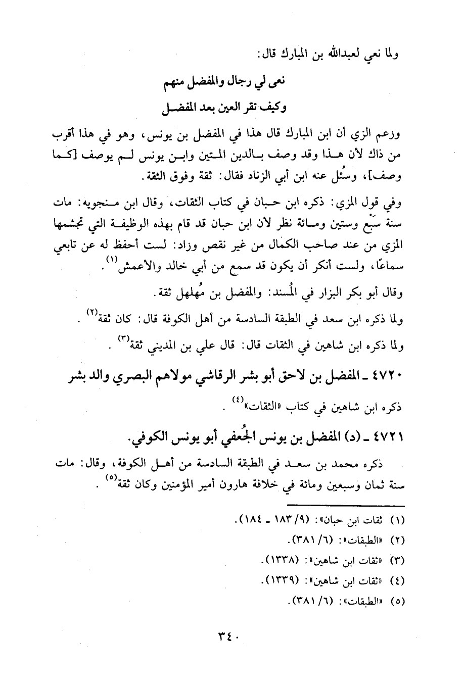 وزعم المزي أن ابن المبارك قال هذا في المفضل بن يونس، وهو في هذا أقرب من ذاك، لأن هذا وقد وصف بالدين المتين، وابن يونس لم يوصف كما وصف، وسئل عنه ابن أبي الزناد فقال: ثقة، وفوق الثقة.