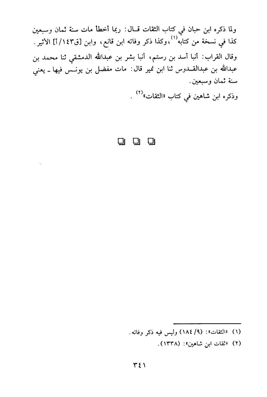وقال القراب: أنبا أسد بن رستم، أنبا بشر بن عبد الله الدمشقي، ثنا محمد بن عبد الله بن عبد القدوس، ثنا ابن نمير قال: مات مفضل بن يونس فيها، يعني سنة ثمان وسبعين.