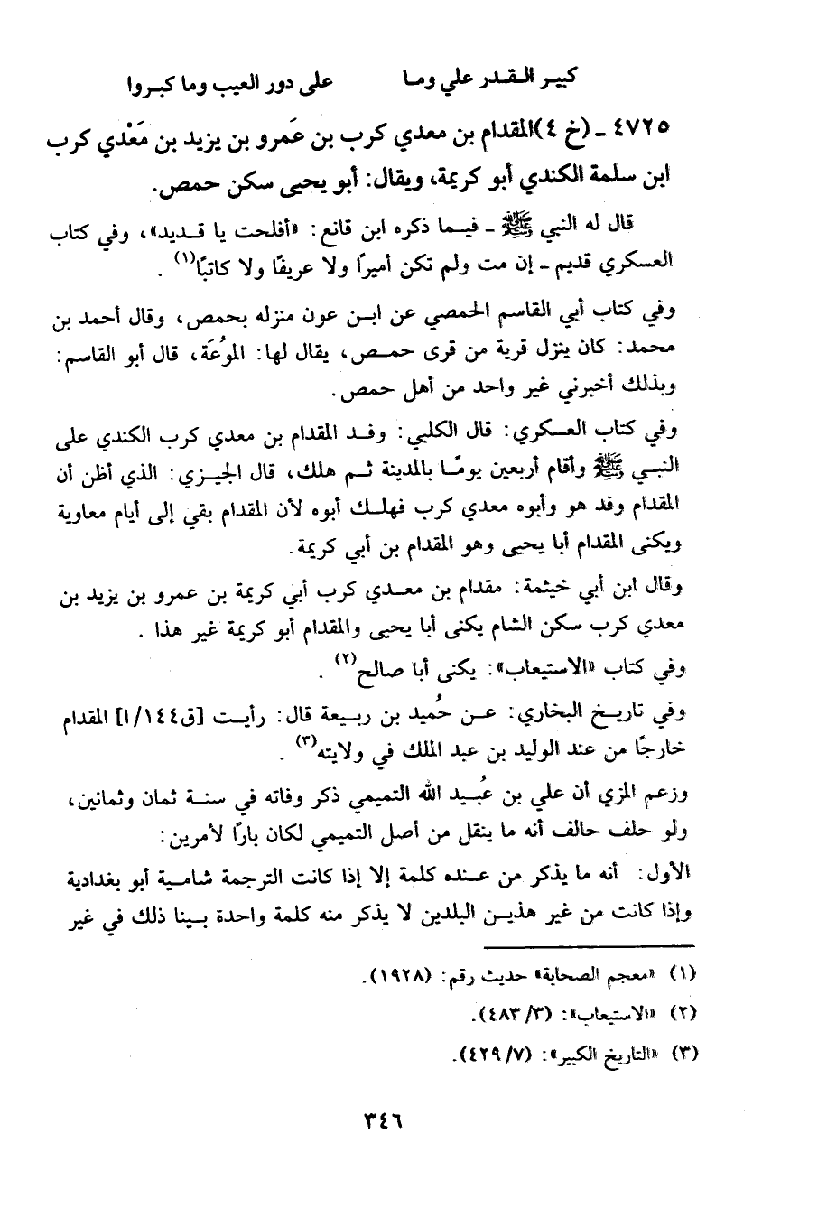 4725 - (خ 4) المقدام بن معدي كرب بن عمرو بن يزيد بن معدي كرب بن سلمة الكندي، أبو كريمة، ويقال: أبو يحيى، سكن حمص.
