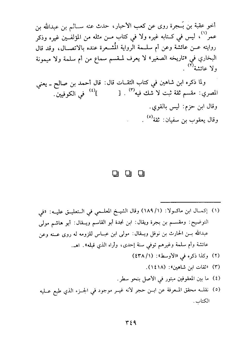 ولما ذكره ابن شاهين في كتاب الثقات قال: قال أحمد بن صالح - يعني المصري: مقسم ثقة ثبت، لا شك فيه. []، في الكوفيين.