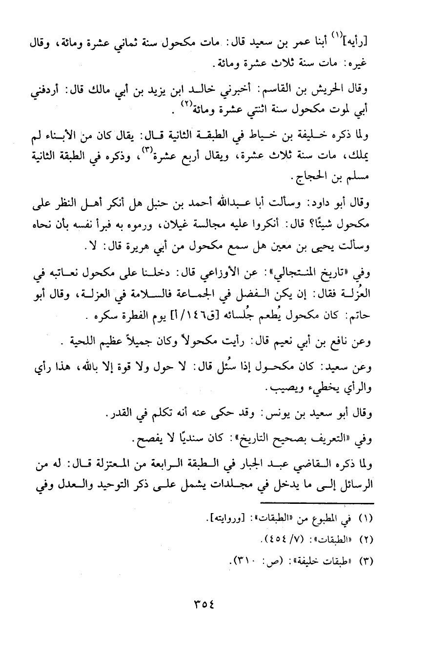 ورأيه. أبنا عمر بن سعيد قال: مات مكحول سنة ثماني عشرة ومائة، وقال غيره: مات سنة ثلاث عشرة ومائة.