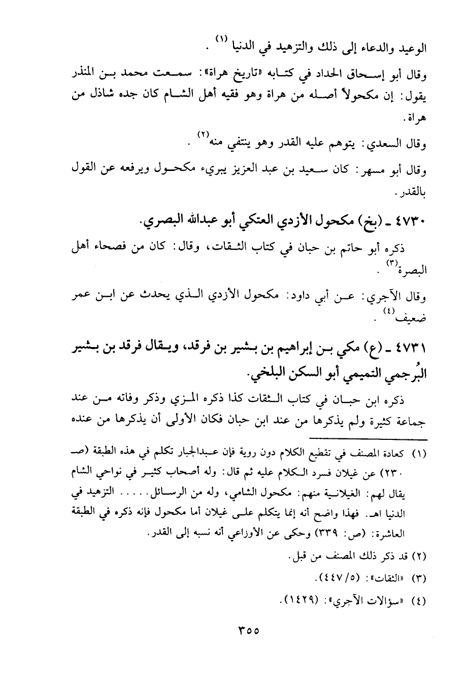 ذكره ابن حبان في كتاب الثقات، كذا ذكره المزي، وذكر وفاته من عند جماعة كثيرة، ولم يذكرها من عند ابن حبان، فكان الأولى أن يذكرها من عنده