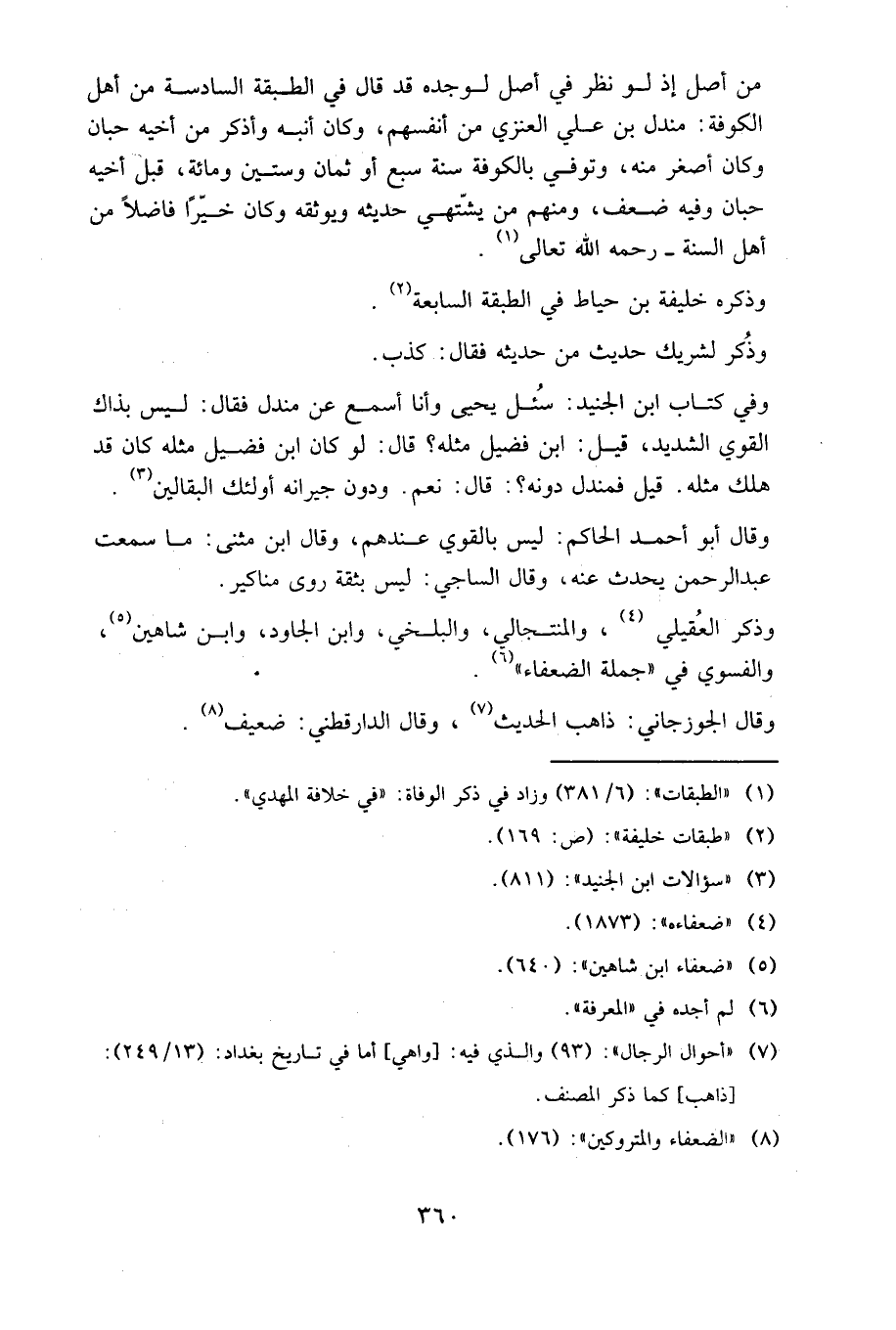من أصل، إذ لو نظر في أصل لوجده قد قال في الطبقة السادسة من أهل الكوفة: مندل بن علي العنزي من أنفسهم، وكان أنبه وأذكر من أخيه حبان، وكان أصغر منه، وتوفي بالكوفة سنة سبع أو ثمان وستين ومائة قبل أخيه حبان، وفيه ضعف، ومنهم من يشتهي حديثه ويوثقه، وكان خيرا فاضلا من أهل السنة، رحمه الله تعالى.