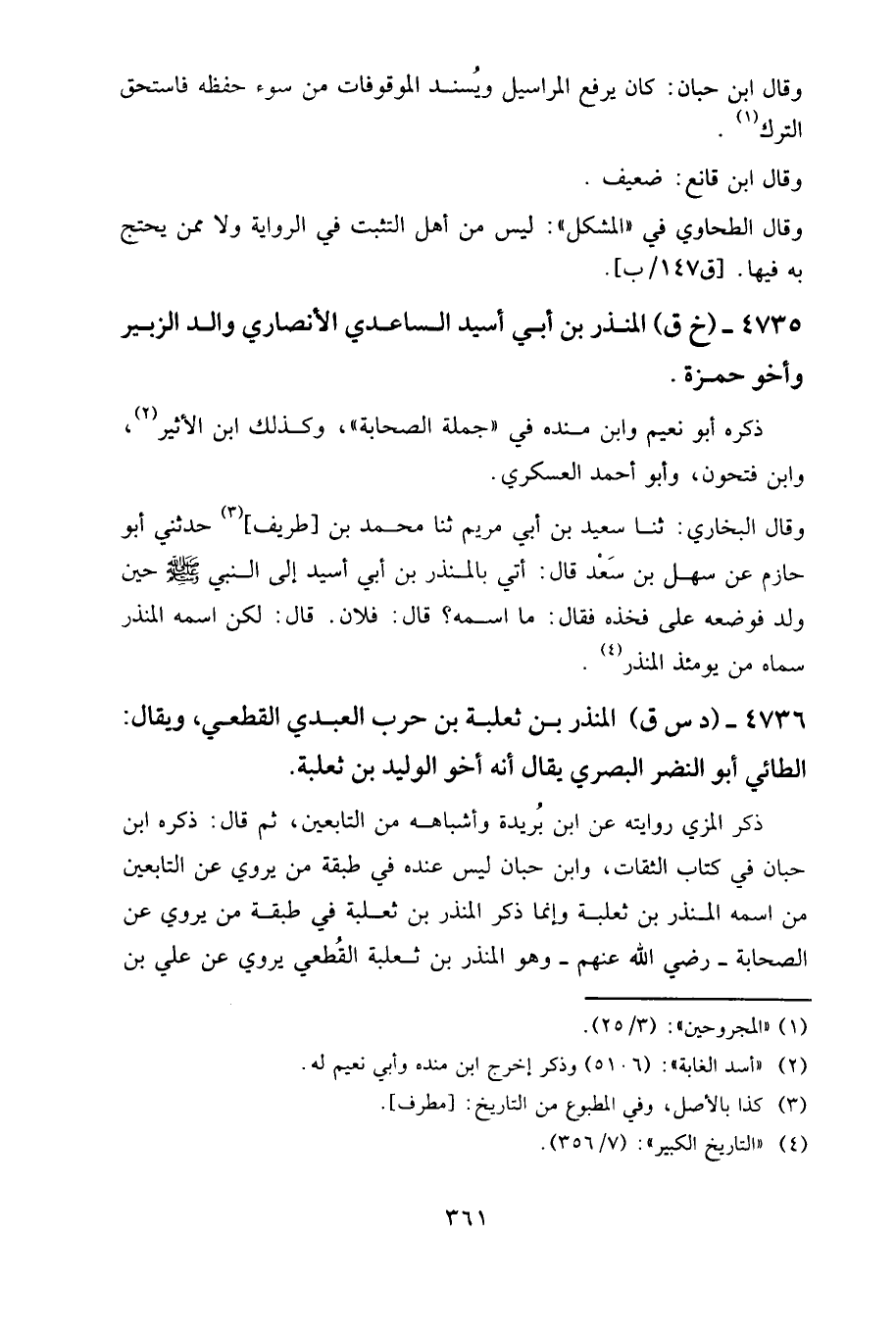 4735 - (خ ق) المنذر بن أبي أسيد الساعدي الأنصاري، والد الزبير، وأخو حمزة.